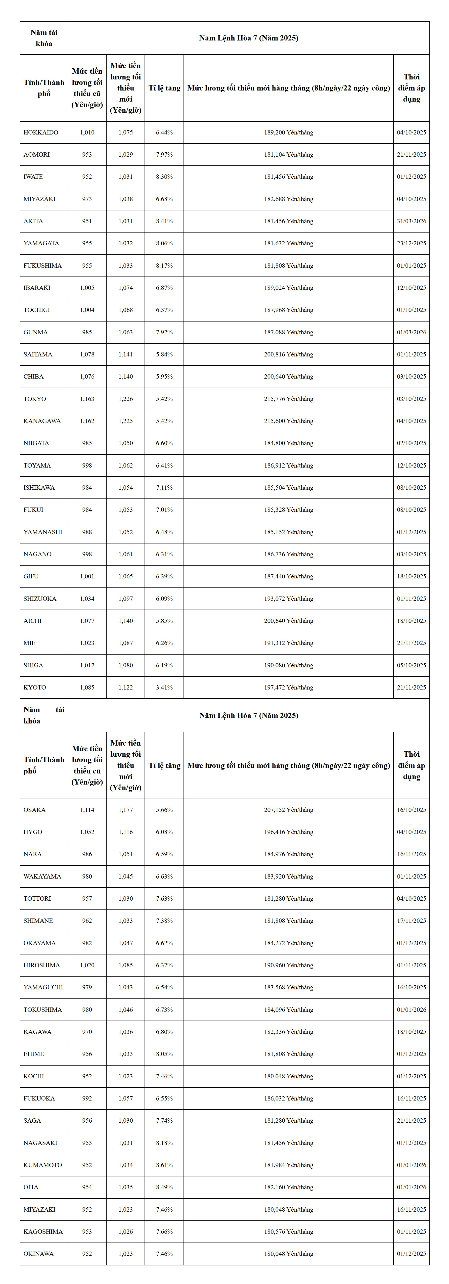 Theo công bố mới nhất của Bộ Y tế, Lao động và Phúc lợi Nhật Bản (MHLW), dự kiến áp dụng sớm nhất vào tháng 10-2025, muộn nhất từ 3-2026, với tỉ lệ tăng dao động từ 3,41% đến hơn 8% so với hiện nay. Cụ thể, mức lương tối thiểu thấp nhất sẽ là 180.048 Yên/tháng tại tỉnh Kochi, trong khi mức cao nhất lên đến 215.600 Yên/tháng tại Tokyo – tương đương khoảng 30,7 triệu đến 36,8 triệu đồng Việt Nam (tùy theo tỷ giá).